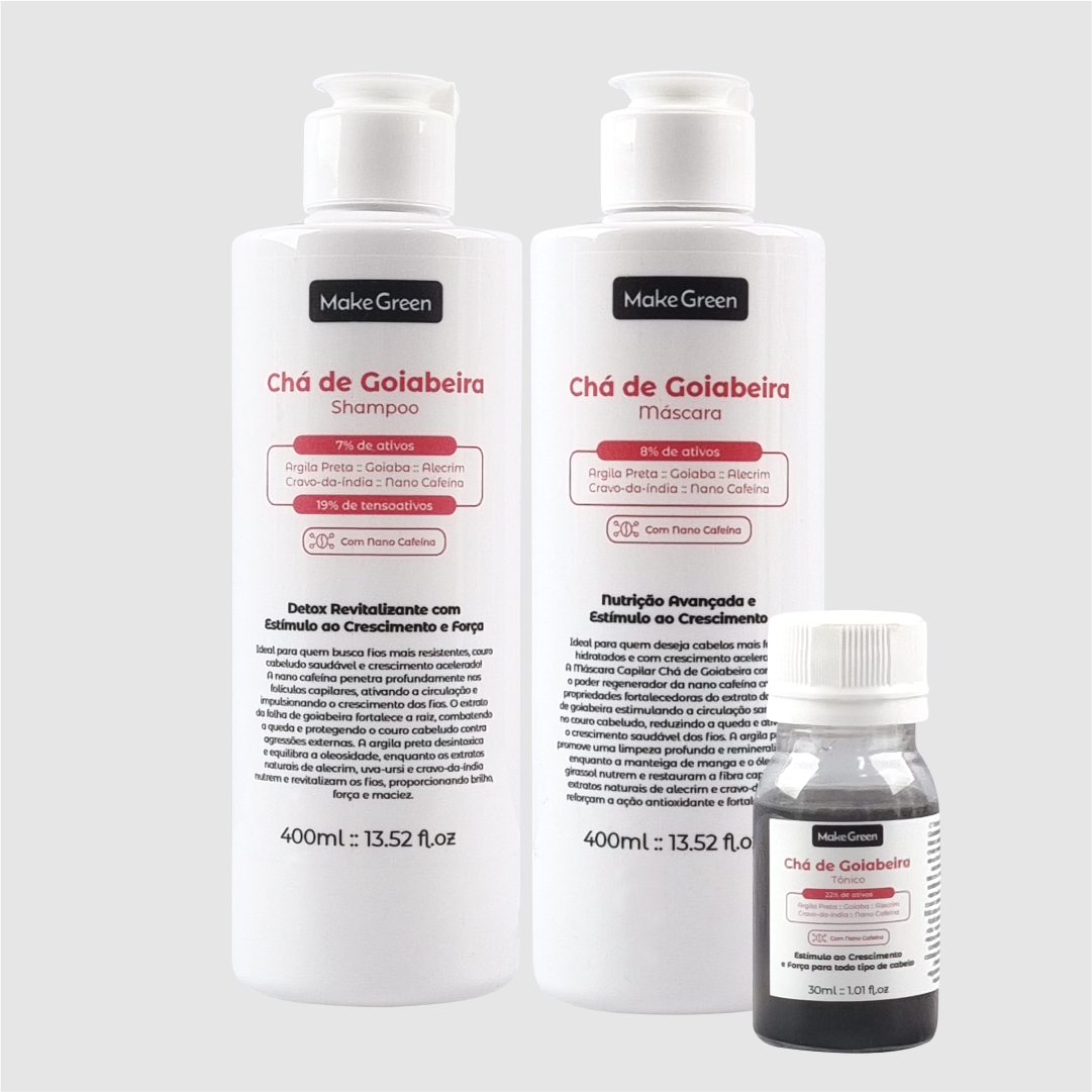 Se você sente que seu cabelo está fraco, caindo ou com crescimento estagnado, o Kit Tratamento Potencializado Chá de Goiabeira é a escolha ideal. Combinando a ação purificante do shampoo, o tratamento nutritivo da máscara e o poder concentrado do tônico capilar, este kit entrega resultados visíveis em menos tempo.